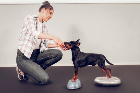 Woman taking care. Dark-haired caring woman wearing squared shirt taking care of her dog