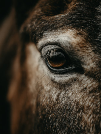 A horse gazes calmly with a rich brown eye, highlighting intricate textures and colors, evoking a sense of tranquility and connection with nature.