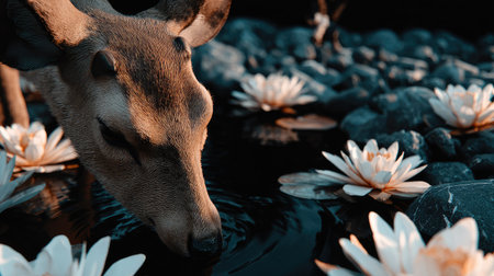 Close-up view of a deer drinking from a tranquil pool of water, surrounded by beautiful white lilies and dark stones. The image showcases the serene beauty of nature, with the focus on the soft lighting and intricate details of the deer and the flowers.