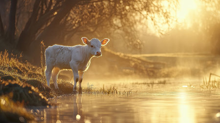 A pedigree calf standing at the edge of a creek, with grass and soft sunlight illuminating its coat.