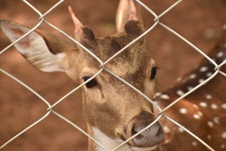 A Barking Deer in a park. View through fence. Animals in captivity.
