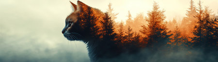 Double exposure of a cat silhouette with a forest landscape