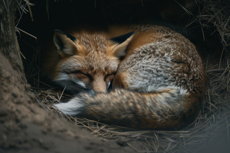 A brown and white fox is sleeping in a hole. The fox is curled up and has its eyes closed. Concept of peace and relaxation, as the fox is in a comfortable and safe environment