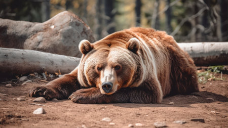 brown bear lies on the ground in the autumn forest and looks at the camera