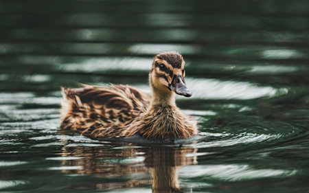 Duckling swimming in the lake. Beautiful duckling swims in the water.