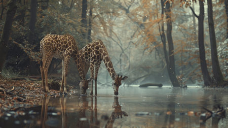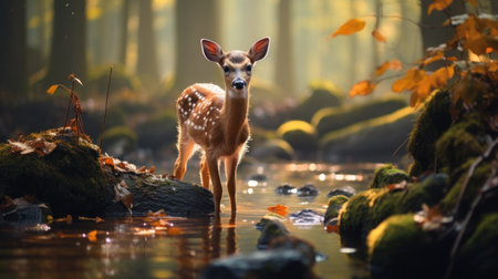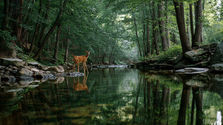 Deer drinking from a clear stream in a tranquil forest, capturing animal life in nature