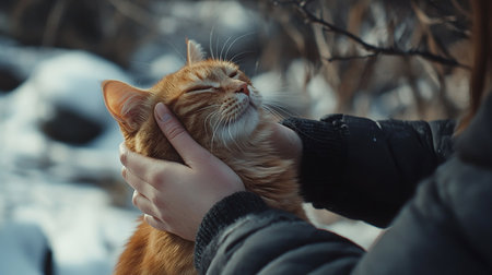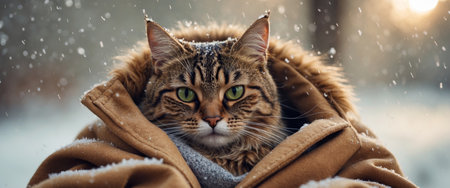 AI Generated. Tabby cat snuggled inside winter coat during snowfall