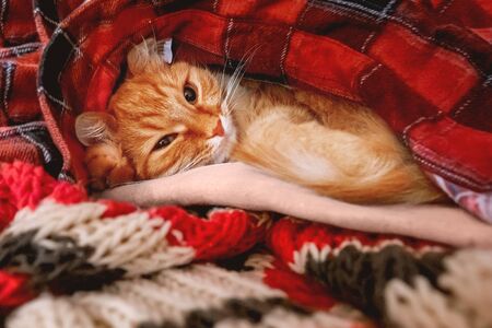 Cute ginger cat sleeps on a pile of warm clothes. Red tartan shirt and scarf are folded in disorder. Fluffy pet is dozing. Cozy home background.