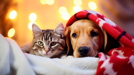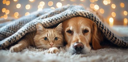 A cat and a dog relax together under a warm blanket, looking comfortable and serene, surrounded by twinkling fairy lights that create a cozy atmosphere.