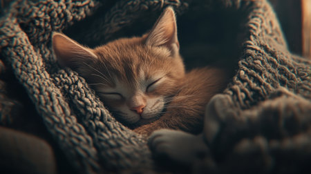 A delightful fluffy kitten nestled within a cozy knit blanket, radiating warmth and cuteness. This heartwarming scene captures pure comfort and innocence.