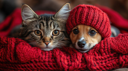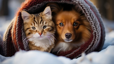 A cute cat and dog peeking out from under a warm knitted rug, surrounded by winter snow, capturing a heartwarming moment.