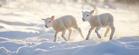 Two lambs playing in snowy field during daytime, winter landscape and nature concept