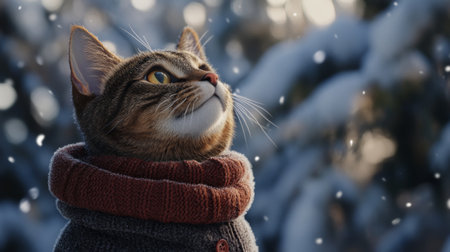 Cat in winter sweater gazing up at falling snow, tranquil moment. Cozy winter and nature concept