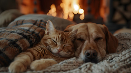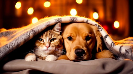 A golden retriever and a tabby cat cuddle closely together under a soft blanket in a cozy living room, showingcasing their friendship in a warm and inviting atmosphere.