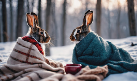 Two rabbits bundled in blankets are enjoying a cozy moment together in a snowy forest
