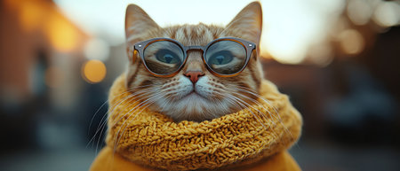 Chic cat wearing sunglasses and a scarf, smirking, urban rooftop, sunset lighting, closeup