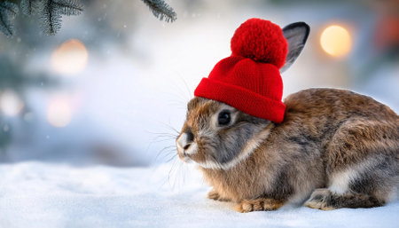 Cute rabbit in a yellow knitted hat on the background of a snowy forest.