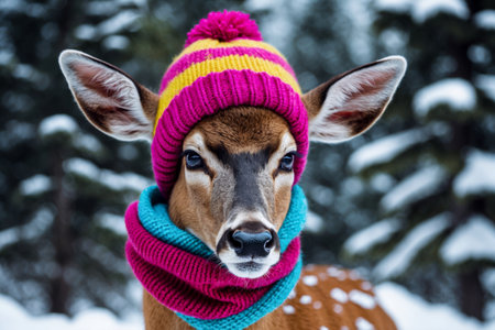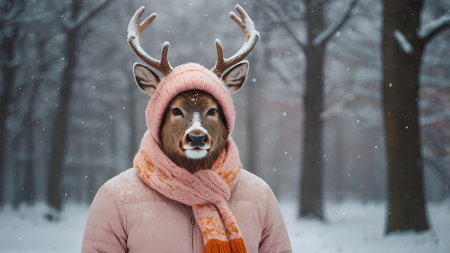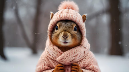 A funny squirrel with big cheeks, dressed in cozy soft pink warm clothes, a hat and a scarf in a winter theme. Seasonal wallpaper.