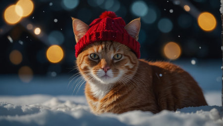Winter-ready cat adorned in cozy clothes, standing stoically on a dark backdrop with subtle highlights