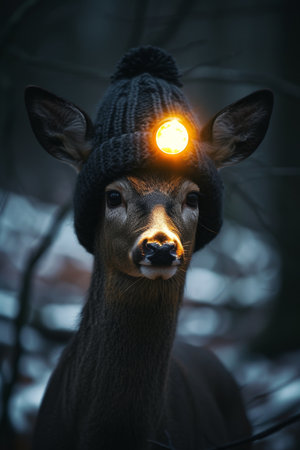 A deer with brown fur and white spots is staring at the camera. The image has a moody and mysterious feel to it, as if the deer is looking directly into the viewer's soul