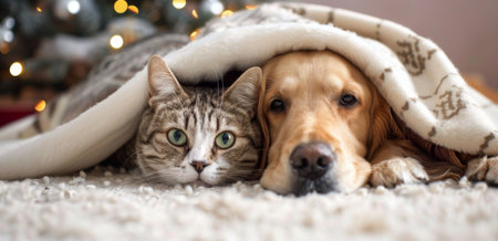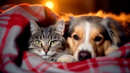 Adorable cat and dog lying under plaid on floor. Warm and cozy winter. High quality photo