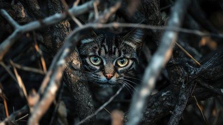 A solitary cat peeks from behind a dense tangle of branches, showcasing its striking eyes and beautiful fur. A perfect representation of wildlife in nature.