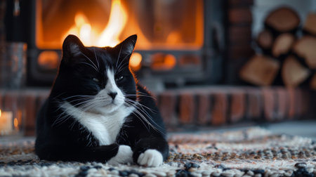 A chubby tuxedo cat resting on a soft rug in front of a crackling fireplace, looking peaceful and warm.