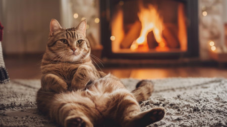 An overweight cat with a joyful grin, sitting on a soft rug in front of a fireplace in a cozy living room