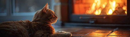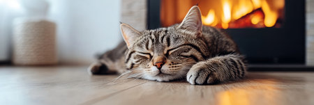 A Striped Tabby Cat Enjoys a Cozy Evening by the Hearth, Keeping Warm in Winter s Embrace