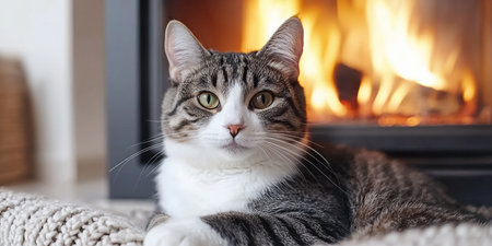 A cozy tabby cat lounging beside a warm fire, enjoying the comfort and creating a peaceful vibe.