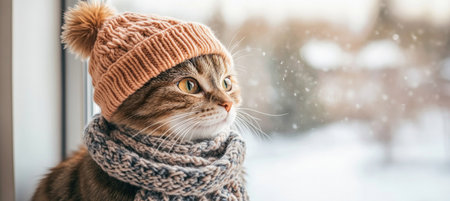 Adorable cat wearing knit hat and scarf looking out window during a winter snowfall