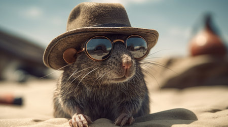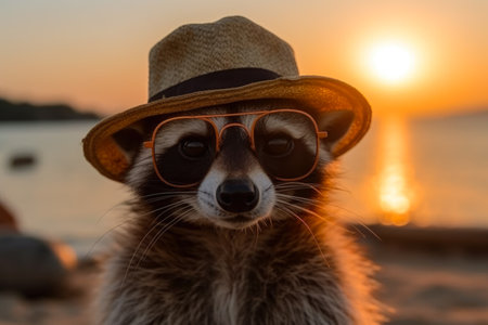 Portrait of raccoon wearing hat and sunglasses on the beach at sunset