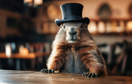 A groundhog wearing a top hat, standing on the edge of a table, looking at the camera. Funny animal photography. --ar 47:30 --v 6.1 Job ID: 361ea984-c494-496a-aa29-30472778f01d