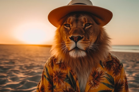 Portrait of a lion wearing a hat on the beach during sunset
