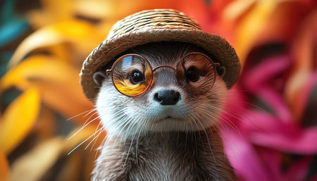 Otter with straw hat, round glasses, colorful backdrop