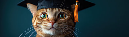 Majestic cat wearing a graduation cap against a blue background