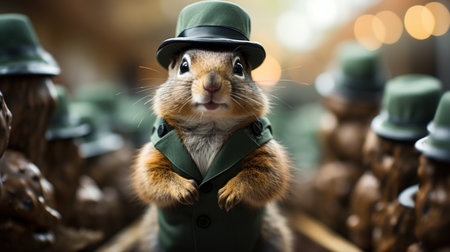 A groundhog in a top hat and suit looks directly at the camera