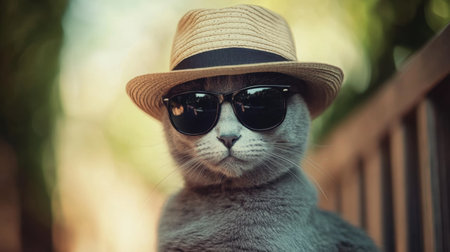Feline wearing a fedora and shades, radiating cool and composed gangster vibe. Cat portrait with style.
