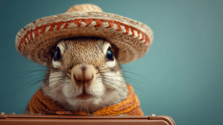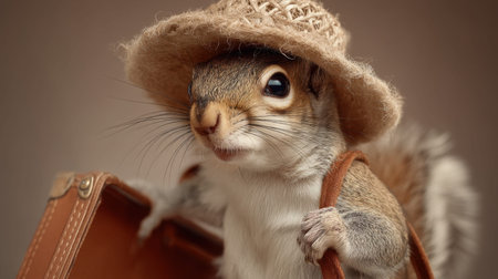 This delightful image features a squirrel wearing a straw hat, holding a suitcase, ready for travel and adventure. A perfect whimsical touch!