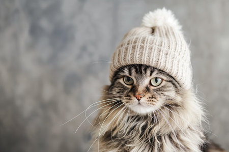 Cute cat in winter hat on gray background.