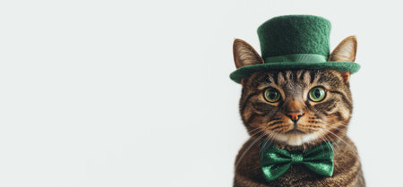 Adorable cat with intense green eyes wearing leprechaun hat and bowtie, looking straight into the camera.