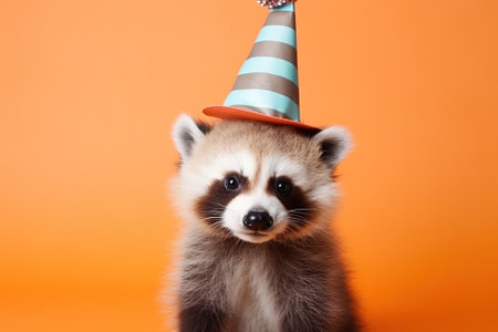 Cute portrait of a baby raccoon wearing a birthday hat on an orange background. in a birthday cap. Space for text