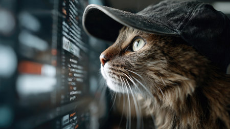A charming and playful cat wearing a cap gazes intently at a computer screen displaying code, showcasing a blend of technology and creativity in a cozy workspace.