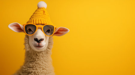 A playful sheep in stylish sunglasses and a yellow hat exudes charm in bright surroundings.