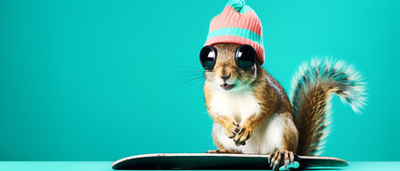 Funny squirrel in ski goggles and scarf isolated on background copy space winter concept.