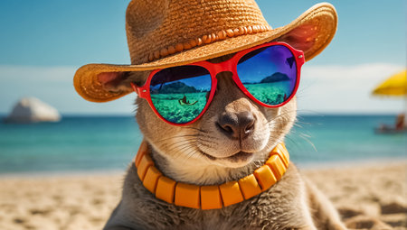 Cute kangaroo portrait on the beach wearing sunglasses