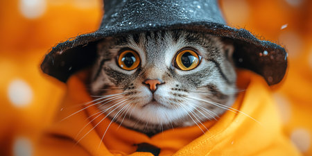 A cute cat in a Halloween costume in the studio on a bright orange background. The cat depicts a witch with pumpkins on Halloween.