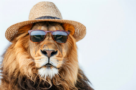 Safari concept: lion in sunglasses and straw hat on a white background with copy space.