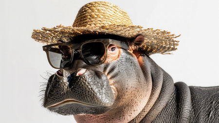 White background with hippopotamusin hat and sunglasses, safari ads.