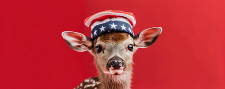 Portrait of a sweet baby deer wearing a stars and stripes hat on a vibrant red background. The deer's gentle eyes and the patriotic hat create a heartwarming and patriotic image.